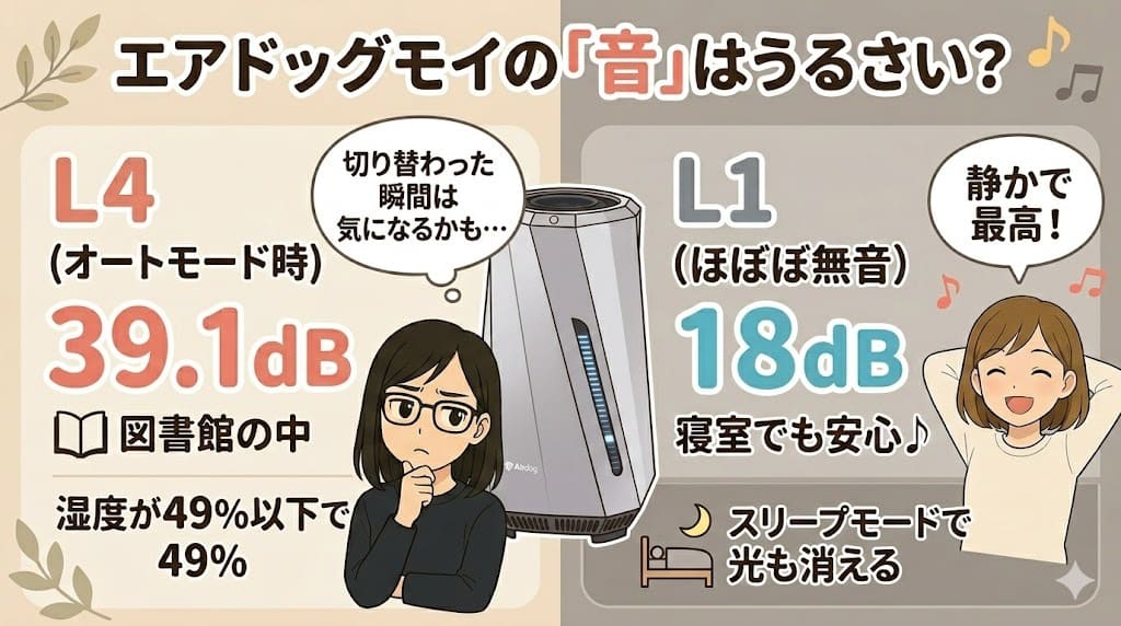 エアドッグモイは、オートモードで湿度が49%以下になるとL4(39.1dB)まで風量が上がります。